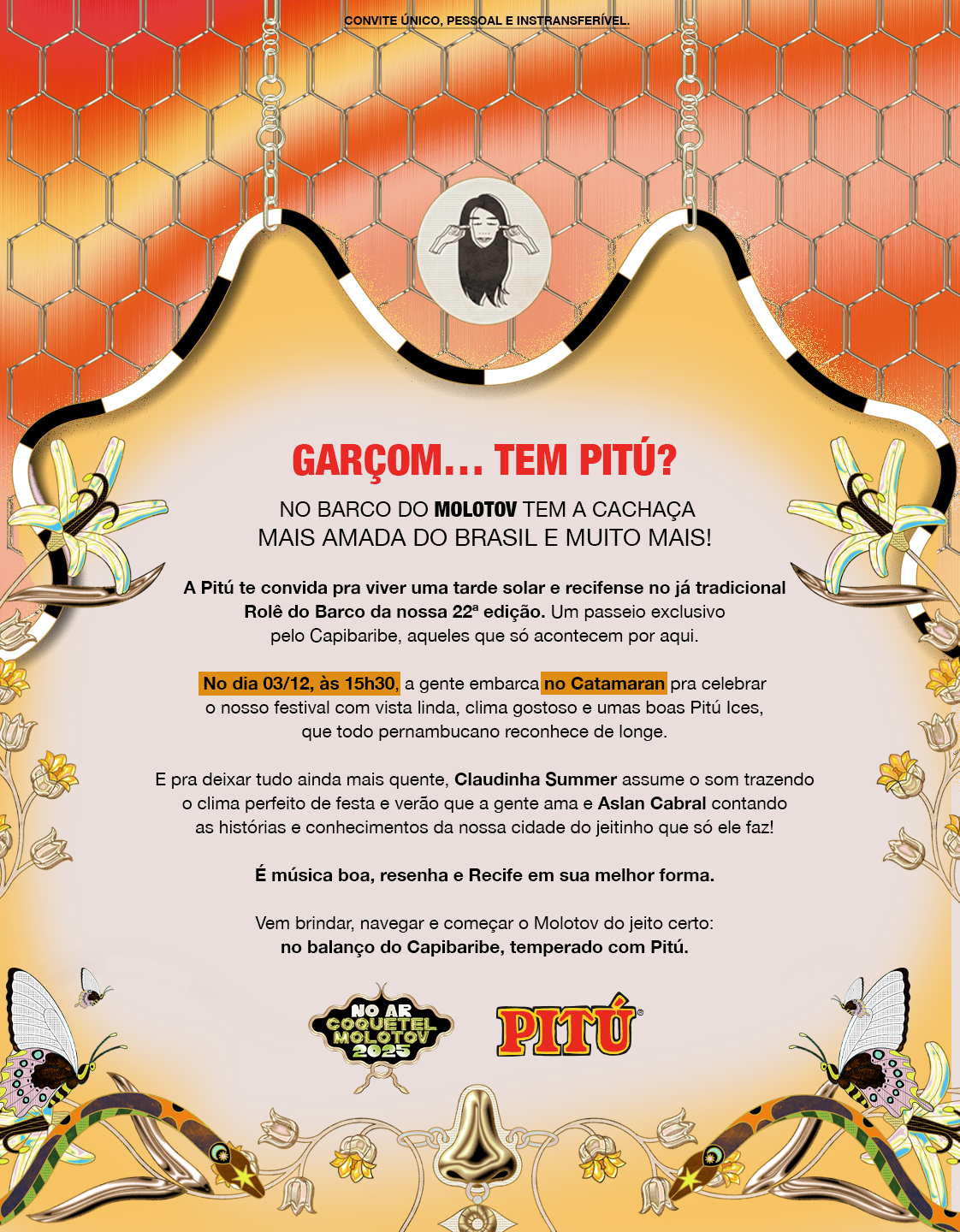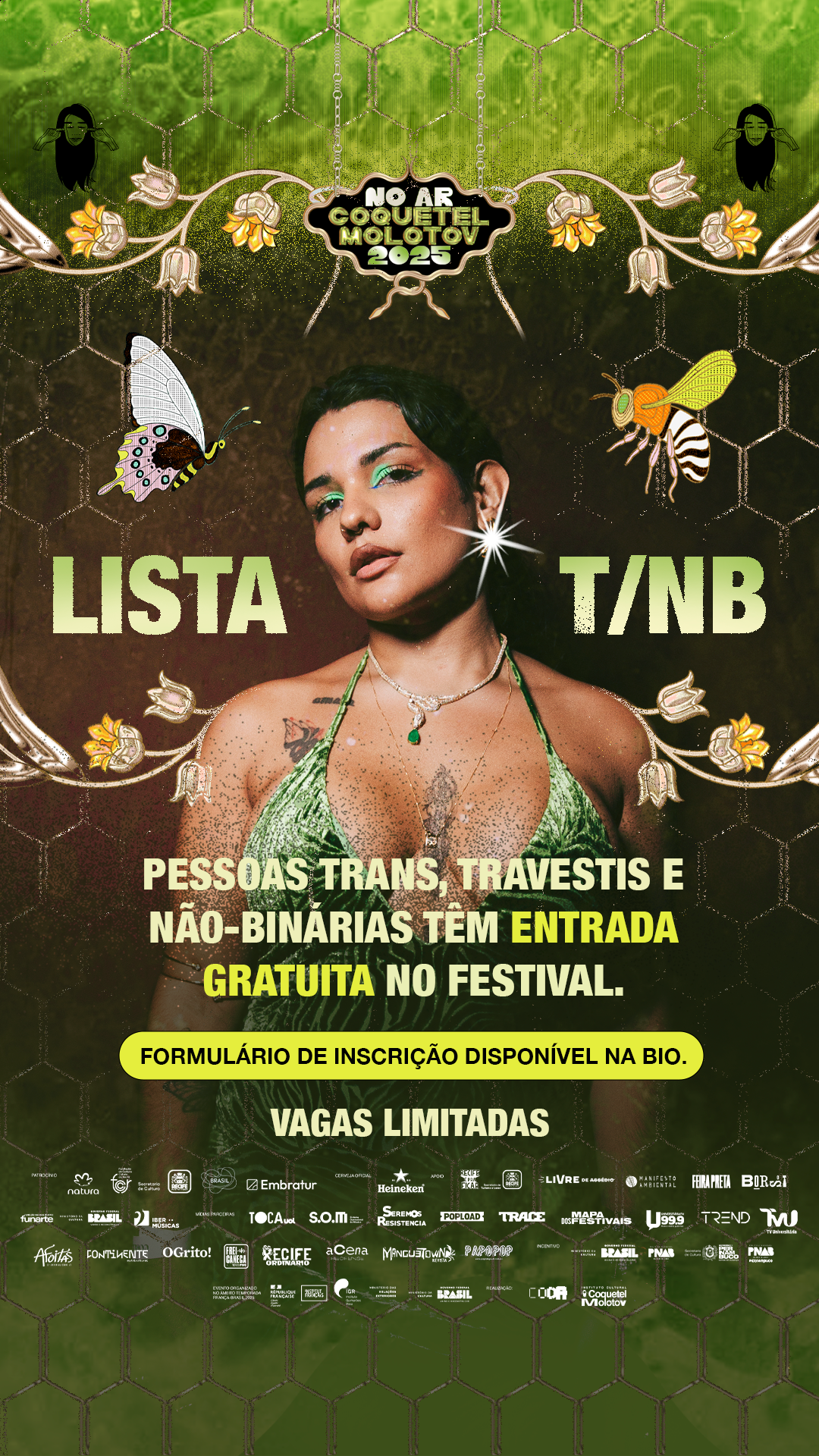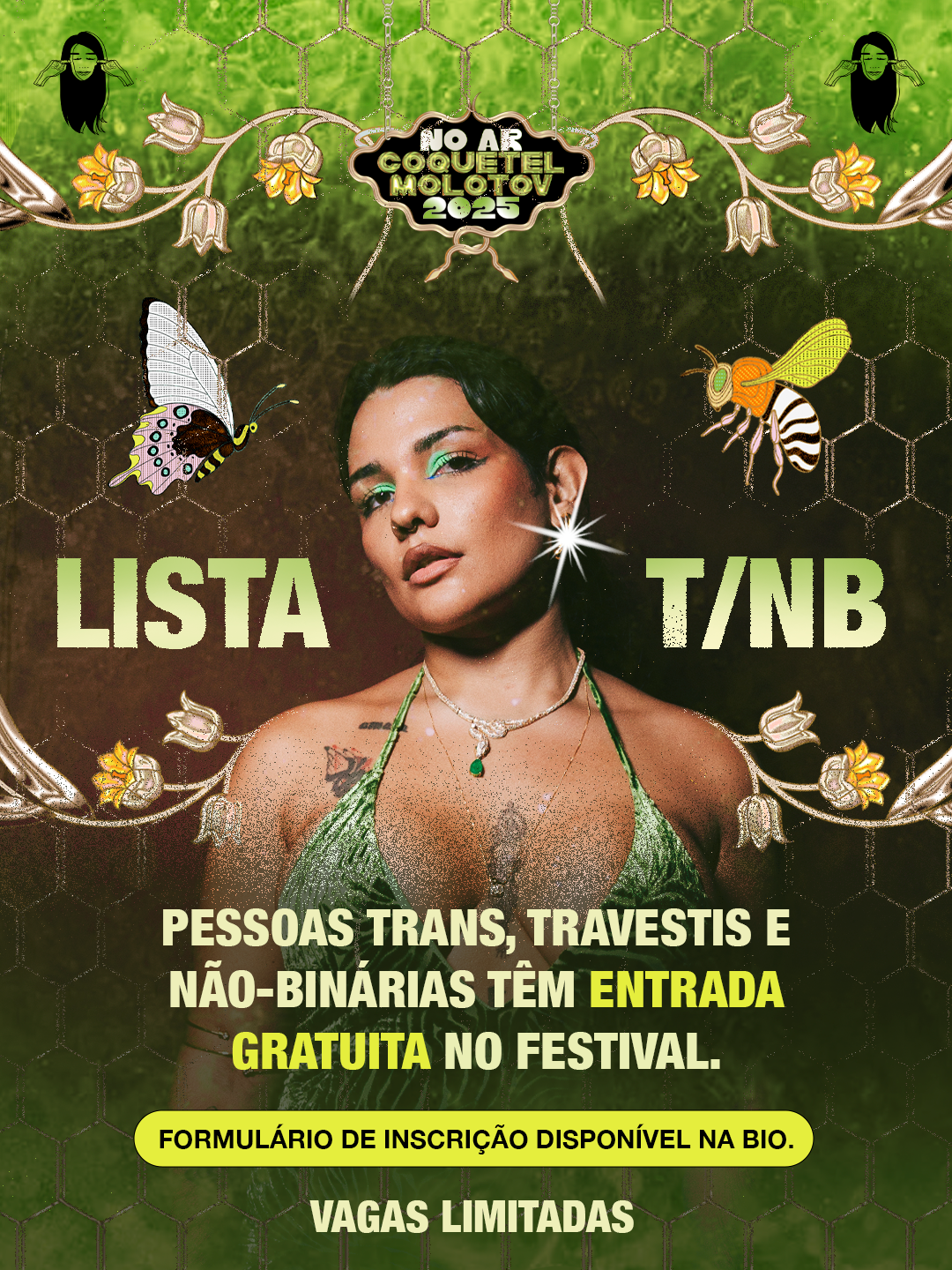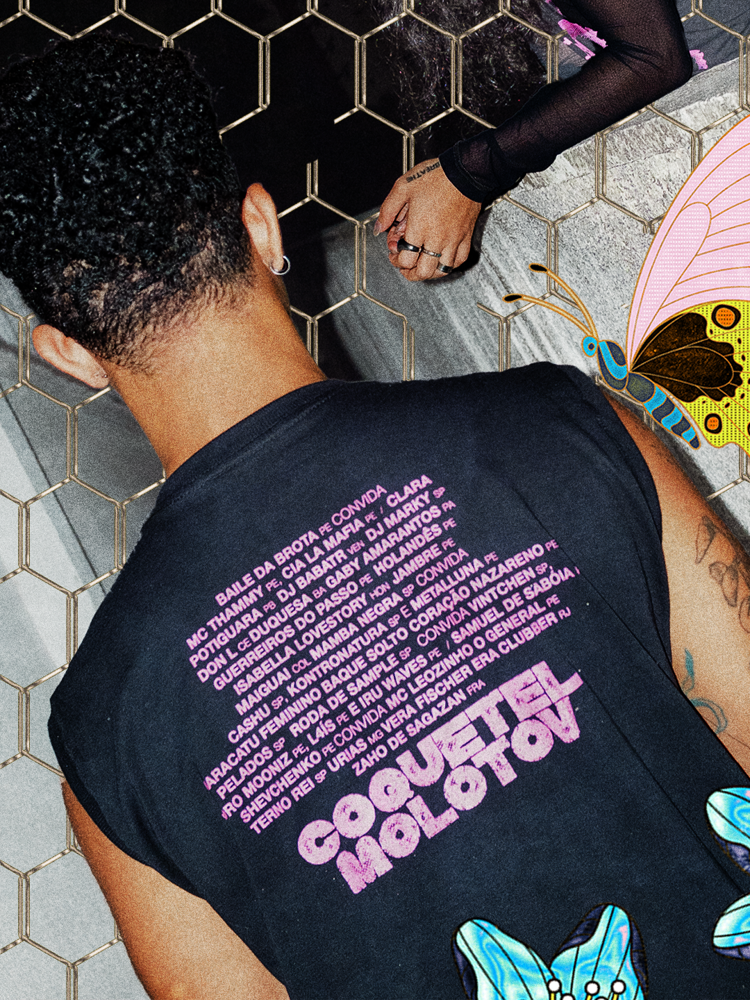 No COQUETEL MOLOTOV 25 estive a frente da criação dos Lambes, de algumas estruturas do festival e tive a honra de contribuir e eternizar a identidade visual criada por GABRIEL AZEVEDO no MERCH OFICIAL DO FESTIVAL. Foi um turbilhão de emoções presenciar a materialização das criações no evento, fica a vontade de mais projetos musicais, de explorar outros lugares da criação dentro do mundo da música.